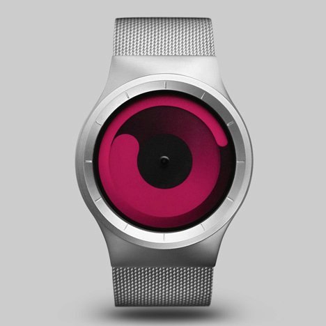 Like their first design, called Gravity, the Mercury watch has no typical hands or markings, instead using two rings that resemble rotating comets to indicate the time. The tip of the inner swirl points to the hour, while the outer swirl indicates the minutes.